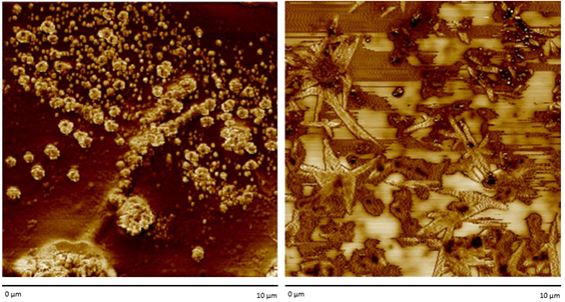 Imágenes de microscopio de fuerza atómica (AFM) con nanopartículas de oro cúbicas, izquierda, y nanopartículas de plata estrelladas, derecha (Departamento de Nanotecnología de SDLE).