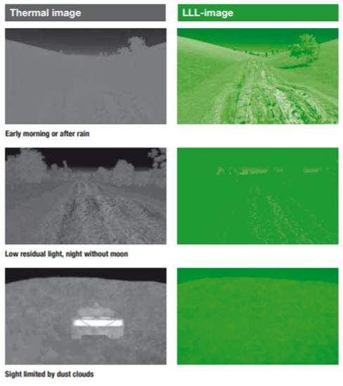 Lo que hace que el dispositivo de visión de este conductor sea tan único es la combinación de un sensor de imagen térmica de alta resolución con una cámara paralela de bajo nivel de luz. Esto permite que SPECTUS proporcione una cobertura perfecta para todo el rango de visión diurna y nocturna. Al crepúsculo y por la noche, la cámara con poca luz aprovecha al máximo la luna restante o luz de las estrellas. Cuando la luz para condiciones óptimas de visión ya no es suficiente cámara, el conductor puede encender la cámara térmica.