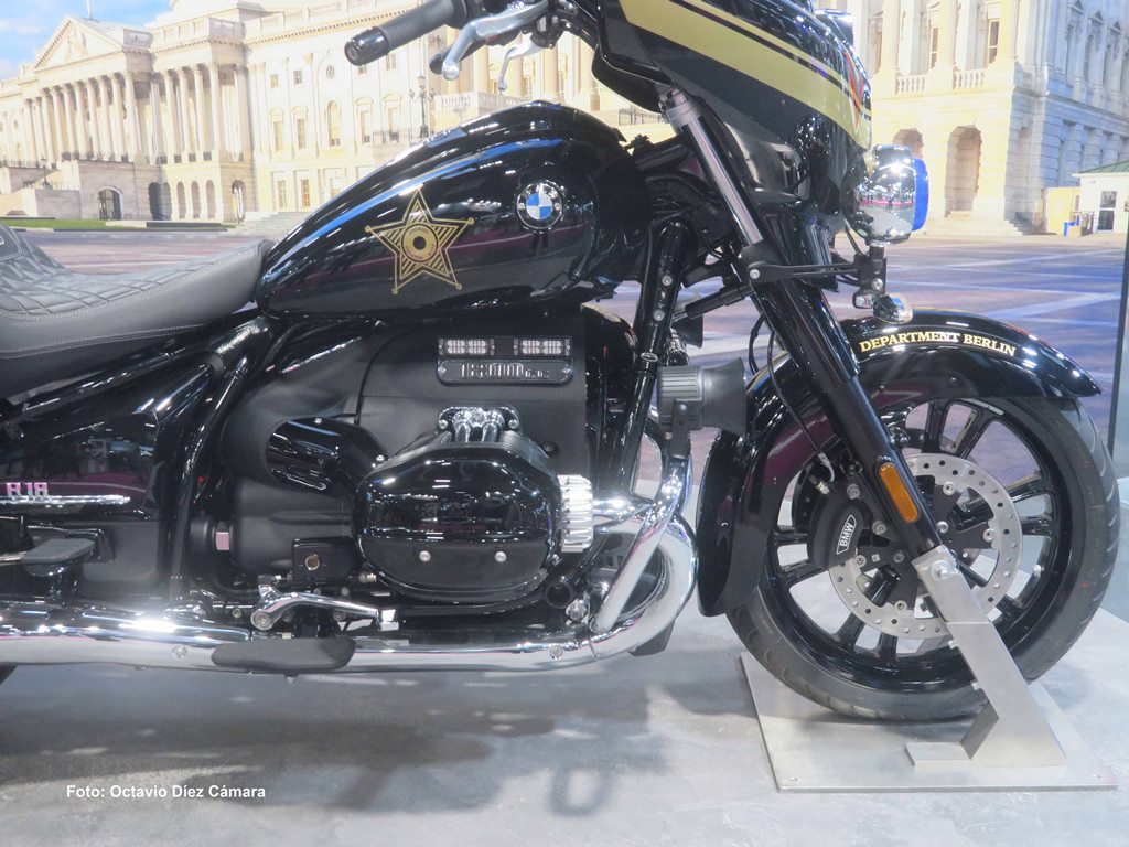 Señalar que la R-18 B-P Concept de BMW, que mide 72 centímetros hasta el asiento, pesa 398 kilogramos en orden de marcha, masa a la que habría que añadir la del equipo específico y la del conductor. Ha sido concebida para poder soportar un peso máximo de 630 kg. No sabemos si su presencia en París busca atraer sobre ella el interés de agencias policiales europeas, lo que sí sabemos es que muchos nos paramos a observarla y fotografiarla.