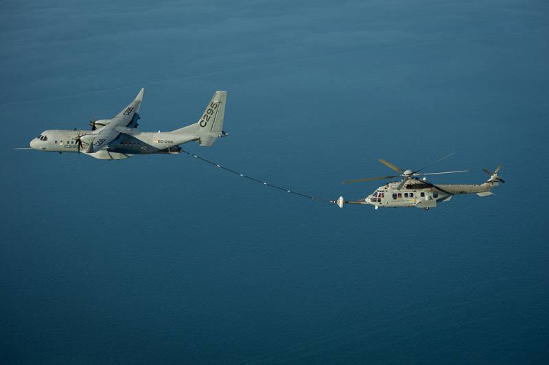 Foto: Momento del repostaje entre el C295W y un Airbus Helicopters H225. Foto: Airbus DS.