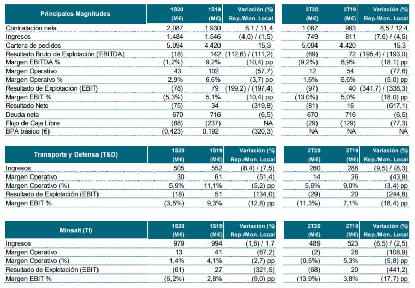 Los ingresos en el primer semestre de 2020 descendieron un 1,5% en moneda local (un 4,0% en reportado), principalmente por la caída de la división de Transporte y Defensa: