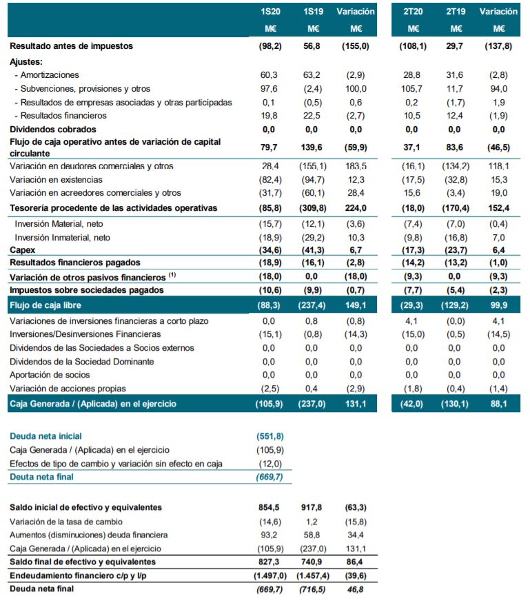 El Flujo de Caja Libre en el primer semestre de 2020 mejoró en 149 millones de euros, situándose en -88 millones de euros frente a -237 millones en el primer semestre de 2019. El FCF en el segundo trimestre de 2020 se situó en -29 millones frente a -129 millones en el segundo trimestre de 2019, gracias al mejor comportamiento del capital circulante.