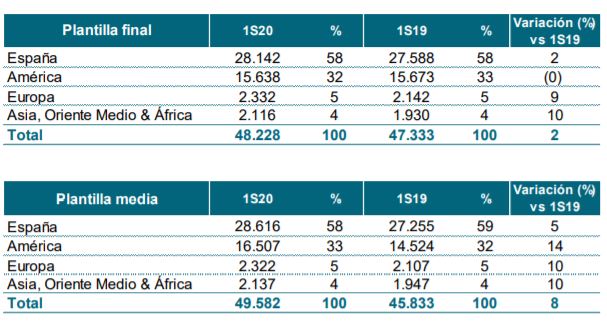 Al cierre del primer semestre de 2020 la plantilla final estaba formada por 48.228 empleados, lo que supone un crecimiento del 2% frente a junio de 2019. La plantilla media en el primer semestre de 2020 frente al primer semestre de 2019 aumentó un 8%. La mayor parte del crecimiento de la plantilla respecto al primer semestre de 2019 tuvo lugar en el tercer trimestre de 2019 y se produjo en la división de Minsait (cerca del 90% del incremento total de la plantilla), por varios proyectos de BPO muy intensivos en personal (principalmente en Latinoamérica).