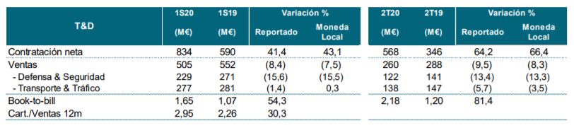 · Los ingresos de la división de T&D en el primer semestre de 2020 descendieron un 7,5% en moneda local, afectados por la caída de Defensa y Seguridad (del 15,5% en moneda local), por la menor actividad en el área de Plataformas y Simulación, peor comparativa del Eurofighter en el semestre, así como por los retrasos causados por el covid. Las ventas en el segundo trimestre de 2020 descendieron un 8,3% con caídas tanto en Defensa y Seguridad (del 13,3% en moneda local) como en Transporte y Tráfico (del 3,5% en moneda local), siendo el impacto del covid más acentuado en este trimestre en Defensa y Programas Internacionales de Tráfico Aéreo.
