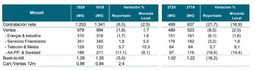 Las ventas de la división de Minsait en el primer semestre de 2020 subieron un 2% en moneda local. Los ingresos crecieron en Telecom y Media (un 10% en moneda local), Servicios Financieros (un 5% en moneda local), y Energía e Industria (un 2% en moneda local), mientras que descendieron en Administraciones Públicas y Sanidad (un 9% en moneda local).