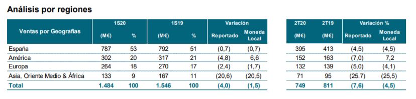 Por geografías, destaca el crecimiento de las ventas en el primer semestre de 2020 en América (del 7% en moneda local; 20% de las ventas totales). El resto de geografías presentan descensos: España (del 1%; 53% de las ventas totales), Europa (del 2% en moneda local; 18% de las ventas totales) y AMEA (del 21% en moneda local; 9% de las ventas).