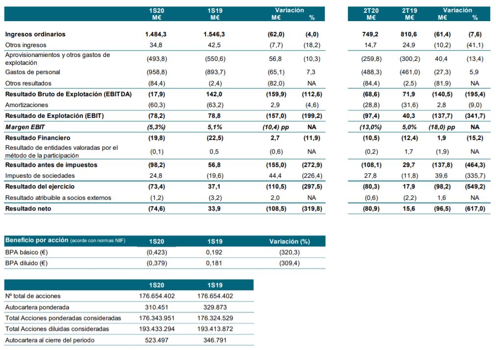 El EBITDA reportado se situó en -18 M€ en el primer semestre de 2020 frente a 142 millones de euros en el primer semestre de 2019, afectado por los deterioros de intangibles (-95 millones de euros), y por los retrasos y la menor actividad debida al covid. Ambos impactos se concentran en el segundo trimestre de 2020. Así, el EBITDA en el segundo trimestre de 2020 fue de -69 millones de euros frente a 72 millones de euros en el segundo trimestre de 2019.