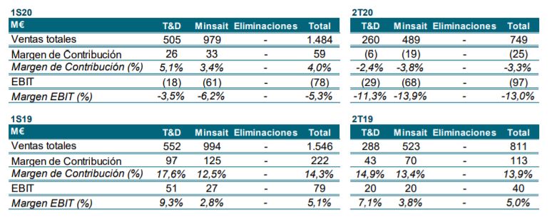 · El Margen Operativo de la división de T&D en el primer semestre de 2020 alcanzó los 30 millones de euros frente a 61 millones en el primer semestre de 2019, equivalente a un margen del 5,9% en el primer semestre de 2020 frente al 11,1% en el primer semestre de 2019. En el segundo trimestre de 2020 el Margen Operativo se situó en el 5,6% frente al 9,0% en el segundo trimestre de 2019. La caída de la rentabilidad se explica por retrasos en el reconocimiento de certificaciones, que a su vez generan sobrecostes en algunos proyectos, por el retraso en la toma de decisiones de clientes por el covid y la peor comparativa del Eurofighter.