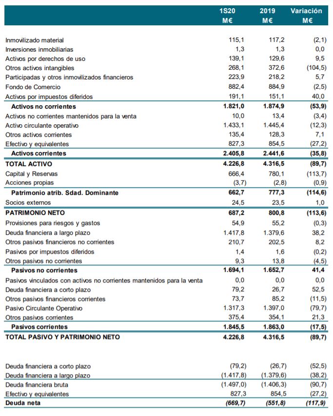 La Deuda Neta alcanzó los 670 millones de euros frente a los 552 millones de euros de 2019 y frente a los 716 millones del primer semestre de 2019. La ratio de Deuda Neta/EBITDA en los últimos doce meses (excluyendo el impacto NIIF 16 y de los deterioros de intangibles) se situó en 2,7 veces en el primer semestre de 2020 frente a 1,8 veces en 2019 y 2,4 veces en el primer semestre de 2019.