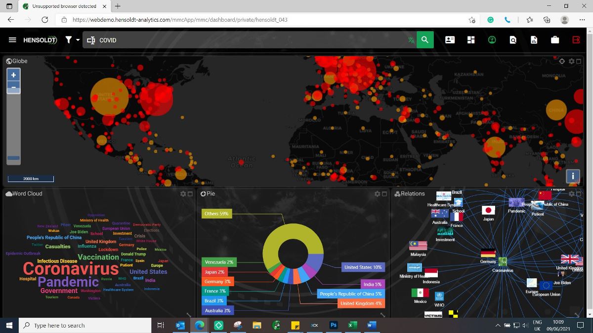 La principal ventaja competitiva del sistema Media Mining de HENSOLDT Analytics es su flexibilidad y modularidad. Como fruto de nuestras inversiones en áreas como la Inteligencia Artificial y el análisis de grandes cantidades de datos, y combinando el reconocimiento automático del habla, detección, seguimiento y clasificación de objetos, traducción instantánea y capacidades complejas de visualización y de procesamiento con la amplia gama de productos de HENSOLDT, ofrecemos una plataforma OSINT integrada y multilingüe y una herramienta de visualización para profesionales.