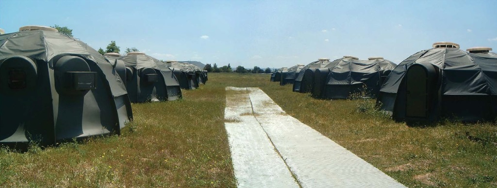 Campamento de la Unidad Militar de Emergencias española formado por módulos CEHAPO (Hispano Vema)