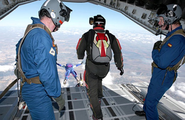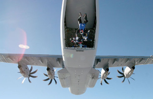 Tom Enders protagonizó otro salto como este en noviembre de 2010, acompañado entonces por el director del programa A400M en la OCCAR, Bruno Delannoy, saltando ambos sobre la zona sevillana de La Juliana. Entonces el grupo de paracaidistas en el que se integraron Enders y Delannoy realizó el salto a través la rampa de carga del A400M. (José Mª Navarro García)