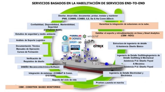 - Ingeniería de Sistemas: que incluye Diseño Mecánico, Diseño Electrónico, Diseño de Software, Integración de Sistemas de Comunicaciones y Sensores en Sistema de Combate, Soporte al Ciclo de Vida (PLM), Pruebas y puestas en marcha, Sistema Integrado de Control de Plataforma (SICP), Soporte técnico in situ y de guardia.