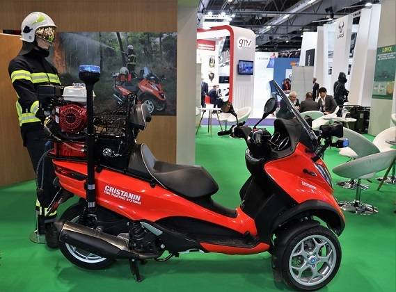 La movilidad del sistema ataque al fuego Fire Stop 200/30 con tecnología water mist se amplía cuando se transporta en una moto, en el stand se pudo ver uno, instalado en un scotter Piaggio MP3 500, se puede transportar igualmente en todo tipo de vehículos pequeños y en embarcaciones de cualquier tipo.