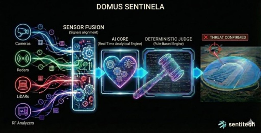 Arquitectura lógica de Domus Sentinela. El sistema fusiona las señales, las procesa mediante un motor de IA analítica y aplica un juicio determinista antes de confirmar la amenaza, eliminando la dependencia del factor humano en la detección. (Sentitech)