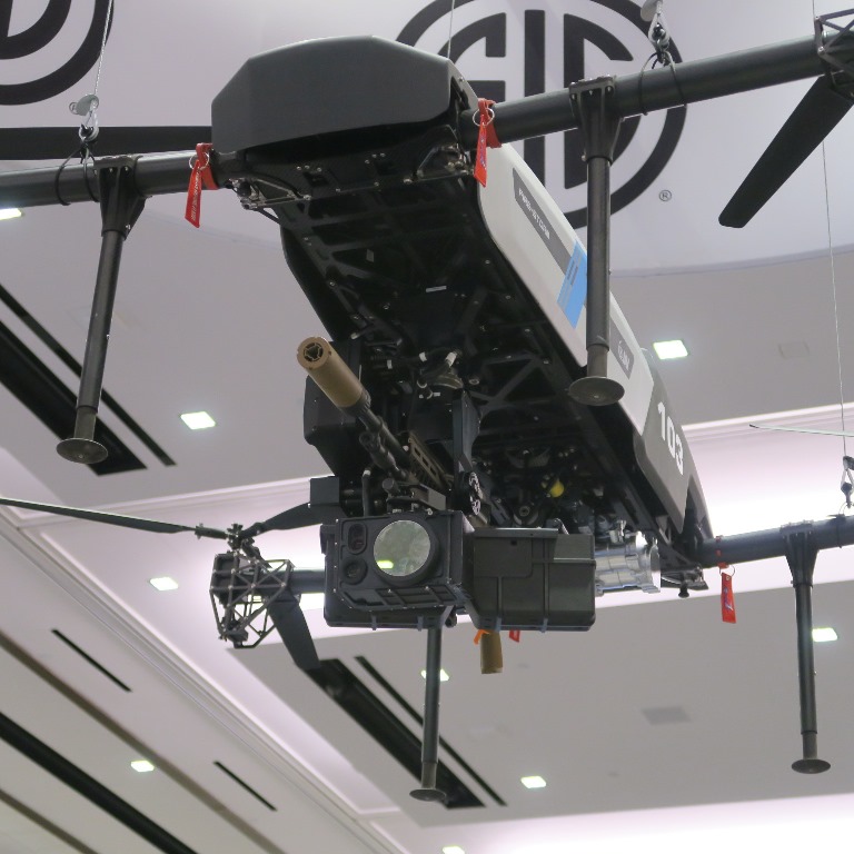 Shot Show es una feria de armas ligeras y municiones, donde también se muestran novedades en sistemas de visión y óptica; además de medios de protección individuales y colectivos, así como cuchillería u otros elementos de utilidad relacionados con la caza, el tiro y otros medios para las fuerzas de la ley. La edición de este año 2026, celebrada en la ciudad de Las Vegas, siguió mostrando igualmente novedades dirigidas al sector policial y de seguridad, incluyendo nuevos productos o servicios destinadas también al sector militar. Una de esas destacables novedades, destinada al terreno militar, ha sido la presentación de drones equipados con armas automáticas; como el mostrado por SIG Sauer, cuyo dron armado con una ametralladora puede proporcionar apoyo aéreo de merodeo. Por otra parte, en la colaboración de la firma Colt con Survice el dron monta un lanzagranadas automático Mk47, que cual incluye igualmente el sistema de control de tiro integrado.