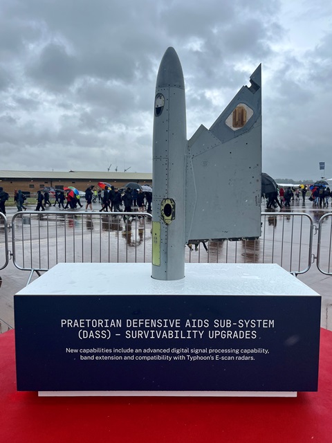 En el marco del Royal International Air Tattoo (RIAT), el mayor evento aéreo militar del mundo que se ha celebrado este fin de semana en Inglaterra, Leonardo anunció, en nombre del consorcio EuroDASS (Leonardo, Elettronica, Indra y Hensoldt), el nuevo paquete de mejoras que incorporará el sistema de autoprotección DASS Praetorian, llevando a cabo una demostración estática de las principales funciones que se añadirán, incluida la ampliación de banda desarrollada por Indra.