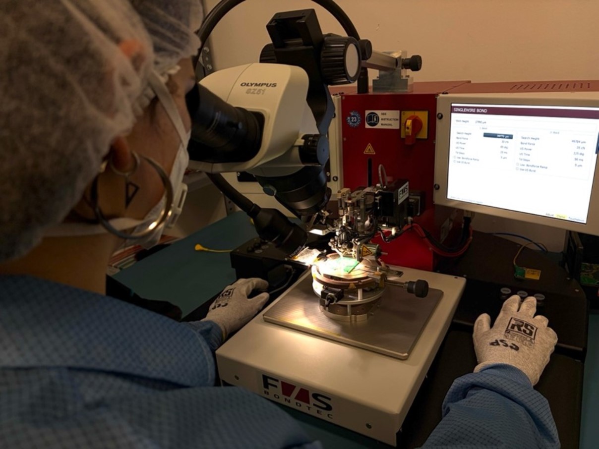 Operario de AGphotonics trabajando en la estación de wirebonding optoelectrónico para el conexionado de chips de silicio con PCBs electrónicas (AGPhotonics)