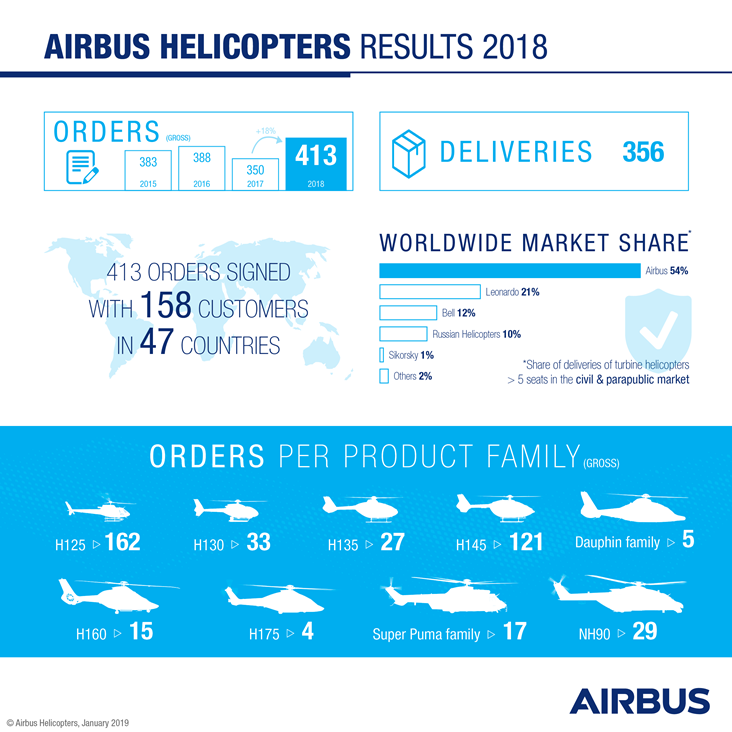 La multinacional europea Airbus Helicopters ha hecho públicos sus números de 2018 anunciando un incremento del 18 % en los pedidos brutos hasta alcanzar las 413 unidades, frente a los 350 del ejercicio anterior. Al final del año pasado la cartera de pedidos era de 717 helicópteros.