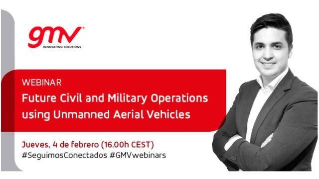 El próximo 4 de febrero a las 16:00, GMV celebrará el seminario web «Future Civil and Military Operations using Unmanned Aerial Vehicles», presentado por Carlos Molina, jefe de Proyecto en la división de Sistemas de Aviónica de GMV. Se abordarán los avances más relevantes que se prevén en relación al uso de vehículos no tripulados tanto en el ámbito civil, destacando conceptos como U-Space o Urban Air Mobility (UAM), como en el ámbito militar, donde este tipo de vehículos jugarán un papel fundamental en los futuros programas de defensa.
