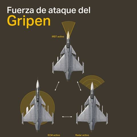 Esa fuerza de ataque ha sido mejorado entre la versión del Gripen A y el Gripen E, que recientemente adquirió Brasil y Suecia, y que está siendo ofrecido a varios países, entre ellos Canadá, Finlandia y Colombia. En la imagen al pie de este texto se observa una fuerza de ataque de tres Gripen. Uno de ellos busca objetivos con el radar, mientras que otro lo hace con el sistema IRST Skyward-G (búsqueda por infrarrojos). Una tercera plataforma activa el sistema de contramedidas electrónicas (ECM), que confunde a los sensores enemigos. Con este conjunto de medidas, los tres aviones son más difíciles de detectar. Si un enemigo dispara un misil, el caza puede desplegar chaffs y flares para esquivarlo.