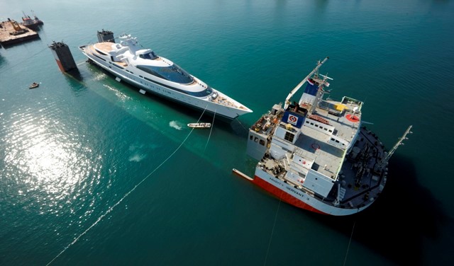 ·Completada su construcción, hubo que transferir el Yas al Mighty Servant 3 para poder botarlo (TTS International)