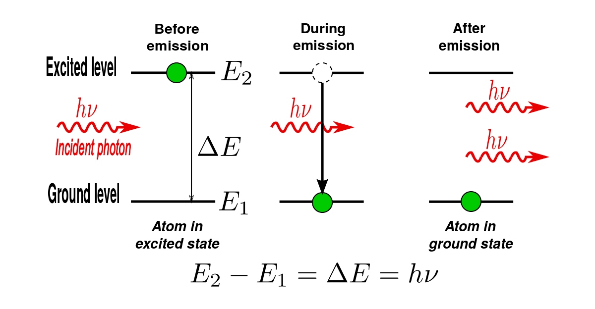La emisión estimulada es un proceso mecano-cuántico en el que una partícula (electrón, átomo, etc.) en un estado energético excitado, al recibir una radiación electromagnética externa, o fotón incidente con una frecuencia (ν) concreta, estimula que esa partícula que está en un estado excitado caiga a un estado energético inferior, sin absorber al primer fotón, y emita otro fotón adicional. Pero la clave no es que emita un fotón por caer a un estado energético menor, que eso ya lo hace de forma espontánea en lo que se conoce como emisión espontánea, sino que al salir emitido este nuevo fotón estimulado lo hace con la misma frecuencia, misma fase y el mismo vector direccional que el fotón primero que ha estimulado todo el proceso. Es decir, obtenemos una radiación coherente, con una probabilidad muy elevada de que los fotones emitidos sean todos gemelos idénticos.