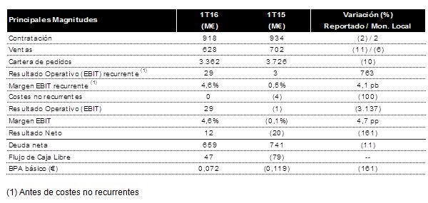 El Margen Directo en el primer trimestre aumentó debido principalmente a la mejora relativa de los proyectos problemáticos provisionados a lo largo del año 2015 y la mayor rentabilidad de los proyectos en curso. A esto se suma el impacto favorable de los programas de optimización implementados en los últimos trimestres, que contribuyen a la mejoría del Margen de Contribución y a los menores costes de Estructura. Como consecuencia de lo anterior, el EBIT recurrente (antes de costes no-recurrentes) en el primer trimestre de 2016 se sitúa en 29 millones de euros, con un margen del 4,6% (frente al 0,5% del primer trimestre de 2015), absorbiendo el impacto del menor volumen de ventas del trimestre.