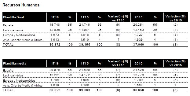La plantilla media al cierre del primer trimestre de 2016 ha disminuido un 6% respecto al cierre del primer trimestre de 2015, principalmente por los planes de eficiencia llevados a cabo en España y Latinoamérica, donde la plantilla media ha disminuido un 7% en ambas regiones respecto al primer trimestre de 2015.