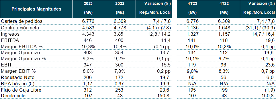 La contratación neta en el 2023 descendió un 3% en moneda local (4% reportado), debido principalmente a la firma de la fase 1B del proyecto FCAS, que tuvo lugar a final del ejercicio anterior (39 M€ en el 2023 vs 575 M€ en el 2022). Excluyendo este efecto, la contratación habría aumentado un 8% en términos reportados: