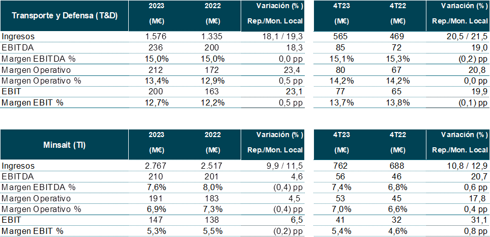 · El Margen EBIT de Transporte & Defensa se situó en el 12,7% frente al 12,2% de 2022. El Margen EBIT en el cuarto trimestre de 2023 fue del 13,7% respecto al 13,8% registrado en el mismo periodo de 2022.