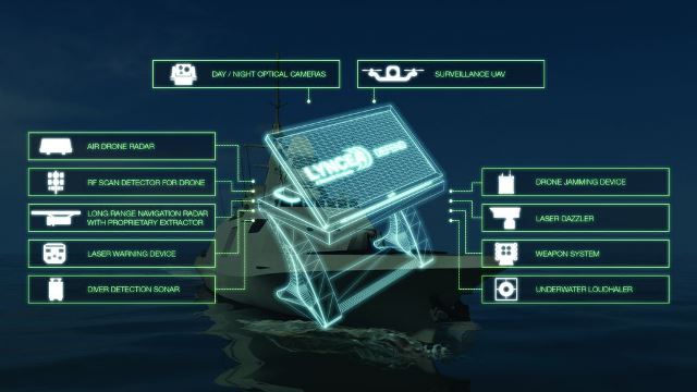 Entre los sensores se incluyen un radar de navegación de largo alcance, un radar embarcado en un UAV, detectores de radiofrecuencia, detectores de buzos, receptores de alerta láser, cámaras diurnas y nocturnas y el UAV de vigilancia Lyncea. Entre las contramedidas están un perturbador láser, dispositivos de jamming para los UAVs, megáfonos subacuáticos y el sistema de armas Lycnea.