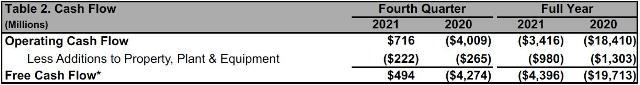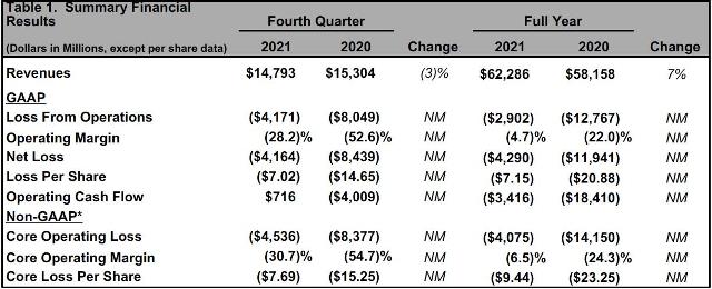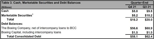 Boeing ha publicado unos ingresos de 14.800 millones de dólares en el cuarto trimestre, que reflejan el mayor volumen de aviones comerciales y menores ingresos en defensa. Las pérdidas de (7,02) dólares por acción (PCGA) y las pérdidas recurrentes de (7,69) dólares por acción (no-PCGA) reflejan menores dotaciones y mayor volumen de aviones comerciales (Cuadro 1). Boeing registró un flujo de caja operativo de 700 millones de dólares. Se registraron ingresos de 62.300 millones de dólares, un flujo de caja operativo de 3.400 millones de dólares y efectivo y valores negociables por 16.200 millones de dólares.