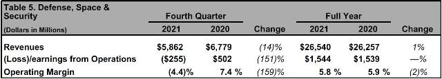 Los ingresos de la división de Defense, Space & Security cayeron hasta los 5.900 millones en el cuarto trimestre y el margen operativo bajó hasta el (4,4) por ciento, principalmente por el menor volumen y el comportamiento menos favorable de toda la cartera, incluida una dotación de 402 millones de dólares antes de impuestos por el programa KC-46A Tanker.