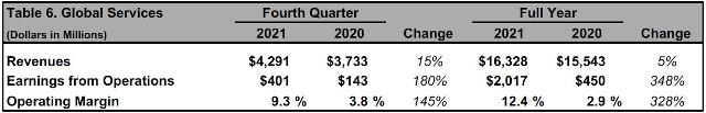 Los ingresos de Global Services aumentaron a 4.300 millones de dólares en el cuarto trimestre, y el margen operativo en el periodo aumentó hasta el 9,3 por ciento, gracias principalmente al mayor volumen de servicios comerciales y al mix favorable. El margen operativo se vio mermado por un ajuste por valoración de inventario por importe de 220 millones de dólares.