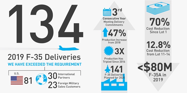La entrega de este avión implicaba importantes hitos en lo que a este programa se refiere puesto que para empezar, la compañía superaba así el objetivo previsto para este año que era entregar 131 aviones de este modelo. Además 134 aparatos suponían un incremento del 47 % sobre la cifra del año anterior y nada menos que un 200 % respecto desde 2016. La compañía se ha fijado para este año 2020 el objetivo de entregar 141 aviones de combate F-35.