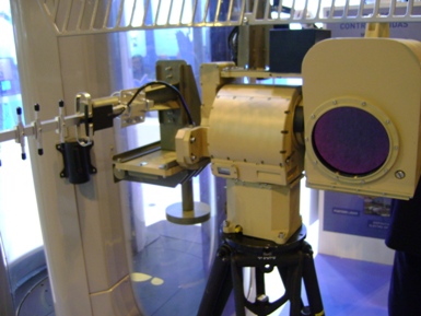 ·Detalle del sistema. Se aprecia la cámara electroóptica, el trípode plegable, un servomotor que orienta el equipo (gimball) y las dos la antena interferidoras, más abajo la de la señal GPS. (Autor)