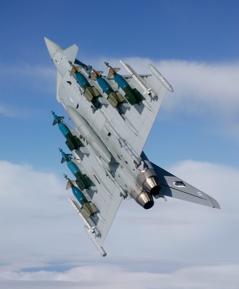 ·El IPA7 sobrevolando las instalaciones de Cassidian en Manching (Alemania), equipado con un designador láser y 2 tanques de combustible y con 2 misiles aire-aire de corto alcance IRIS-T, 4 aire-aire de medio alcance AMRAAM y 4 bombas “Paveway IV” (foto Josef Gietl/Cassidian).
