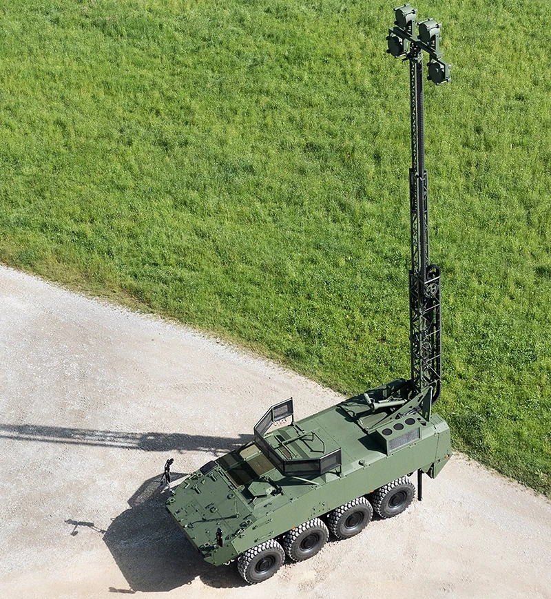 Como pudimos apreciar junto al personal de la empresa, el compartimento de tropa ofrece un amplio espacio interior en el que es posible ubicar numerosos racks asociados al sistema de comunicaciones. En este caso el mástil incluía repetidores de microondas para comunicaciones en línea visual, siendo idóneo como plataforma para comunicar los sistemas de comunicaciones estratégicas con las tácticas desplegadas en el campo de batalla.