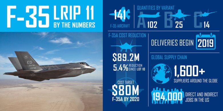 El Departamento de Defensa estadounidense y el fabricante aeronáutico Lockheed Martin publicaron recientemente los datos del contrato que formaliza el pedido número 11 del avión de combate F-35. Concretamente el LRIP 11 (Low Rate Initial Production o Producción Inicial de Baja Cadencia) que incluye la fabricación de 141 aeronaves de las tres versiones por un importe de 11.500 millones de dólares destaca por la bajada del precio de las tres versiones. Este contrato incluye 91 aviones para el Departamento de Defensa estadounidense, 28 para socios internacionales y 22 para socios dentro del programa Foreign Military Sales (FMS) cuyas entregas comenzarán en 2019.