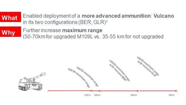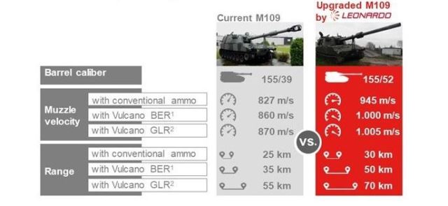 Por ejemplo, la última ha sido actualizada por la multinacional italiana Leonardo que propone modernizar el M-109 empezando por la sustitución de su cañón de 155 mm., que pasaría de ser de 39 calibres de largo del actual a 52 calibres, lo que permite aumentar la velocidad de salida de los proyectiles y aumentar el alcance, por ejemplo pasando de 25 a 30 km. con munición convencional.