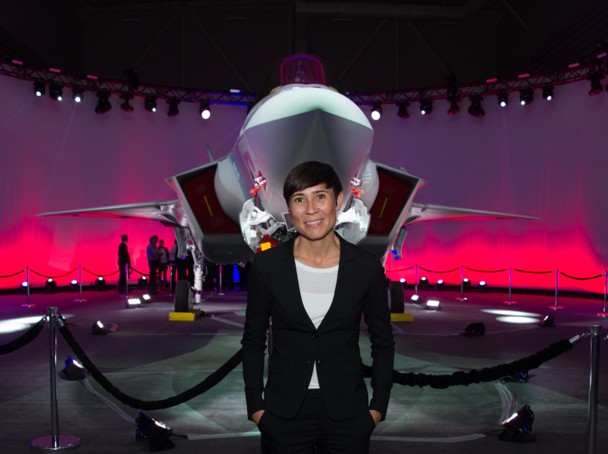 Fotografía: La ministro noruega de Defensa, Ine Eriksen Søreide, delante del primer F-35A de su país en la factoría de Lockheed Martin de Fort Worth (Texas).