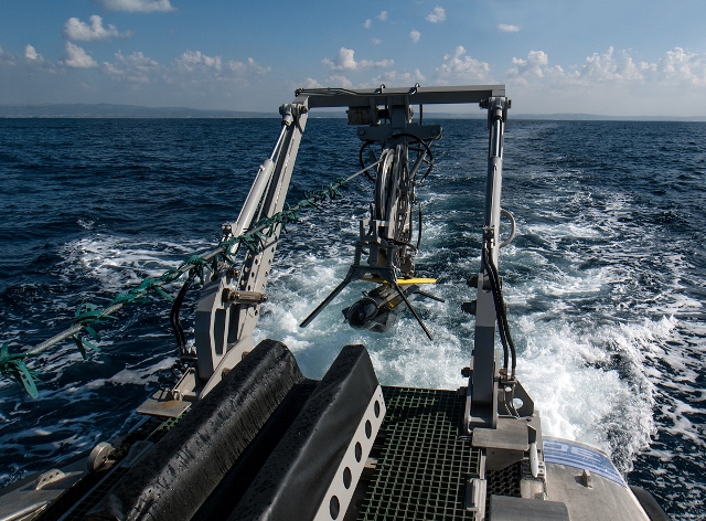 ·Se aprecia la ausencia de puente de mando y la grúa totalmente extendida, desplegando o recuperando el sonar (Elbit Systems)