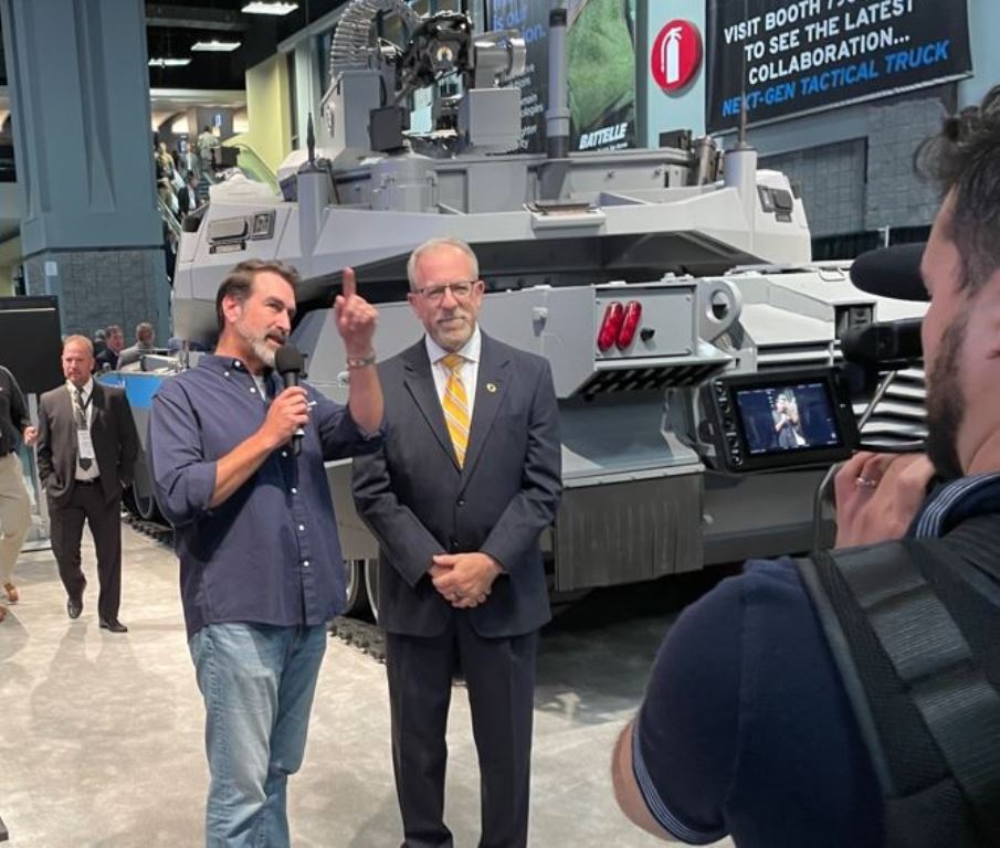Esta instantánea tomada con motivo de una entrevista realizada por el actor y humorista (y ex marine) Rob Riggle en el estand de GD permite ver la parte trasera del AbramsX. Se aprecian las antenas de comunicaciones y un mástil meteorológico en la torre, así como los lanzadores de efectos del sistema Trophy, algún tipo de lanzadores verticales próximos a estos y una cámara de conducción trasera, entre otros detalles. (GD Land Systems)