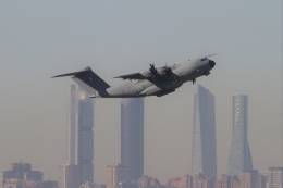 El vuelo de vuelta de un Airbus Defence and Space (DS) A400M del Ejército del Aire francés desde el aeropuerto de Madrid-Barajas hasta su base en la nación vecina, la de Orleans-Bricy, nos ha permitido captar esta imagen en la que se ven al fondo uno de los más modernos símbolos de la capital de...