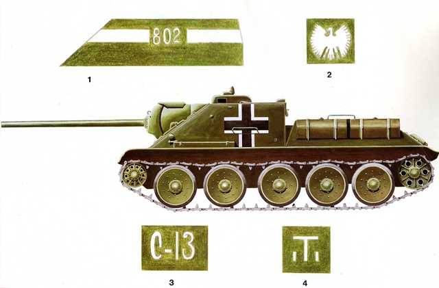 Una buena prueba de Ia calidad de este cazacarros puede ser Ia lámina adjunta. En ella se ilustra un ejemplar capturado en buenas condiciones de funcionamiento por los soldados de Ia División alemana Gross Deustchland a mediados de 1944, e inmediatamente puesto en servicio contra sus propietarios originales. Esta unidad llegó a tener compañías completas equipadas con material soviético capturado. AI objeto de identificarlo de manera inequívoca se le pintaron unas cruces negras de considerable tamaño en los lados de Ia casamata que comprometían seriamente Ia mimetización del carro.