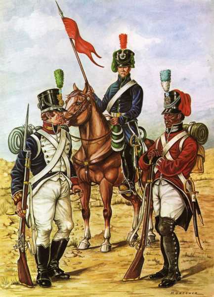 El uniforme se componía de chacá negro con penacho blanco y azul y cordones del mismo color, paño caído rojo; casaca roja con puños, cuello y vueltas en negro; las botas cubiertas por polainas largas en negro. Las armas eran las normales en la infantería: fusil de chispa, sable corto curvo y bayoneta de cubo..