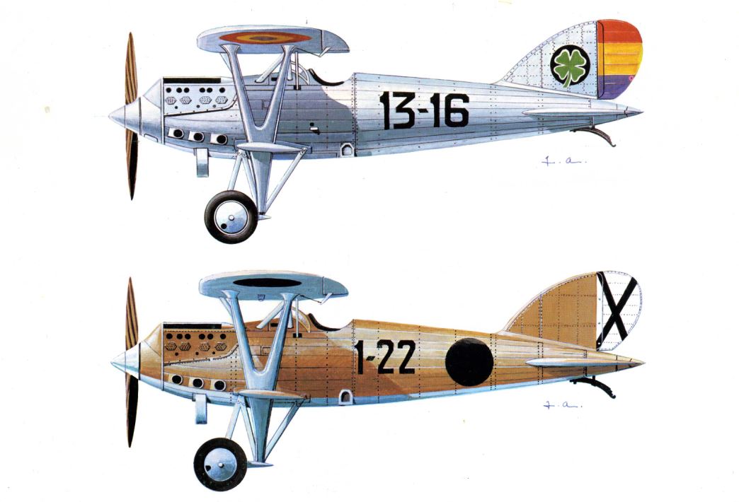 En 1936 el Hispano Nieuport-52 era el avión de caza de protección de la Aviación de la República española con 35 aparatos en servicio distribuidos en el Grupo 11 en Getafe, Grupo 13 en el Prat y una escuadrilla del Grupo Mixto 12, en Tablada. Al producirse el Alzamiento del 18 de julio quedaron del lado del Gobierno 26 aparatos de los Grupos 11 y 13, pues una escuadrilla de este último destacada en Armillas (Granada) se había reintegrado al Prat, en junio. La zona nacional contó con los nueve aparatos de Sevilla al mando de Gil Mendizábal, cuyo emblema era un ciervo saltando.