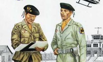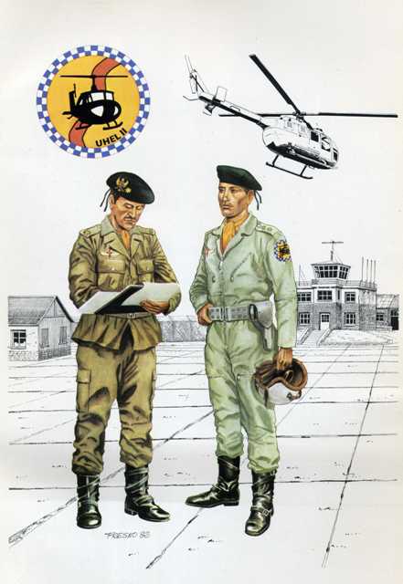 Las ilustraciones de la lámina adjunta muestran a un comandante con el uniforme de instrucción y campaña dando sus órdenes a un teniente piloto enfundado en el uniforme de vuelo. El emblema que figura en el ángulo superior izquierdo corresponde a la UHEL-II.