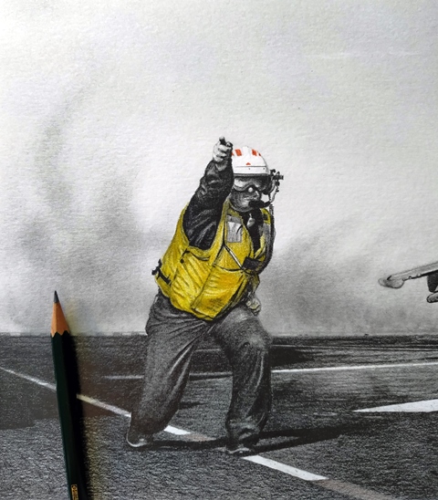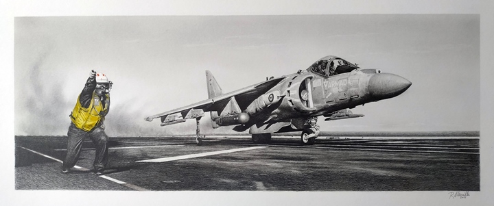 Acto seguido el piloto confirma las referencias visuales y ladeará la palanca central (joystick) hacia estribor (derecha) mientras hace pequeñas compensaciones con el “Trim”, potencia y los pedales. Una vez que el Harrier está encima de su spot, el piloto solo tiene que reducir la potencia del motor hasta posarse en la cubierta del buque. Acto seguido corta la inyección de agua, reconfigura las toberas a cero grados, flaps en automático y ocupa el estacionamiento indicado por un director de movimiento (chaleco amarillo).
